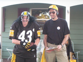 Tom made his own costume with his black shirt I always said made him look like Bill Cowher back in the day. He added the logo to the shirt. He got a clipboard from the neighbor and made up a playbook full of naughty cheerleading pictures, added a headset and his Steelers hat. I think we did a fine job in the end, and thought we should have won the costume contest, but alas we lost out to two sumo wrestlers in store bought costumes. Whatever!
